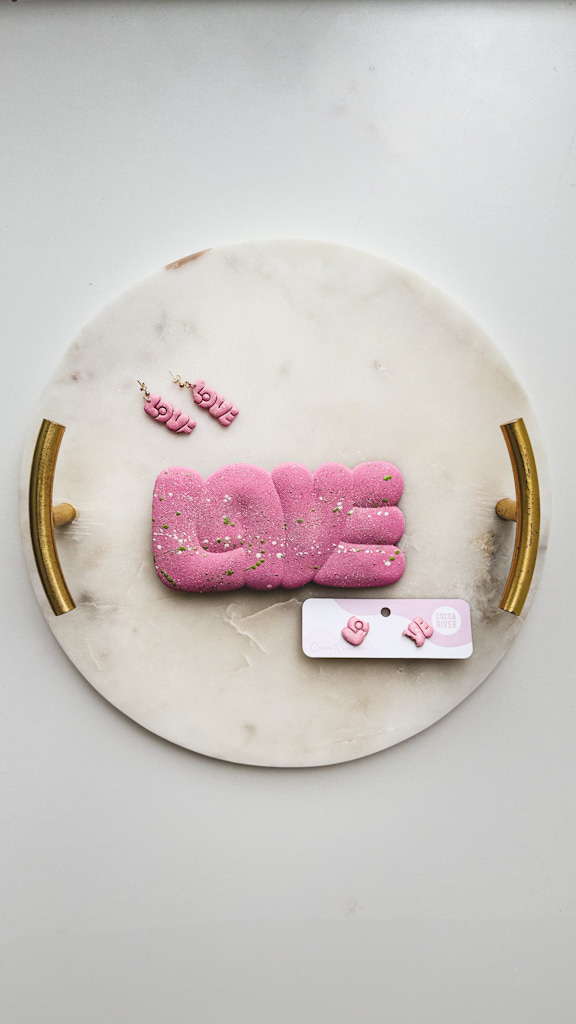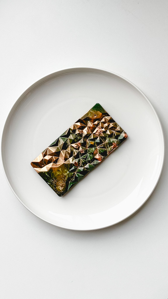 On her website, she displays a rainbow of intricately shaped chocolates. Whether it’s ‘Love’ written in squished typeface covered in gold, brittle designed in pink, geometric ridges, or bubbly blue bars, it’s hard not add to your cart immediately.