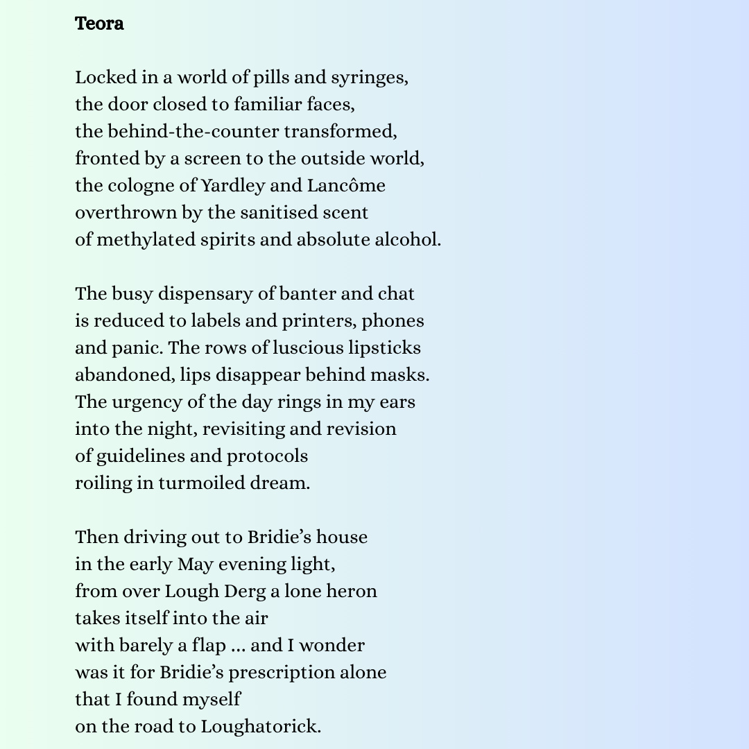 “One is in relation to delivering from the pharmacy. One is about an old workhouse here and it's a building I'm really interested in and its history. The most recent one was a poem I wrote when the writer Edna O’Brien died. So, there's quite a span.”