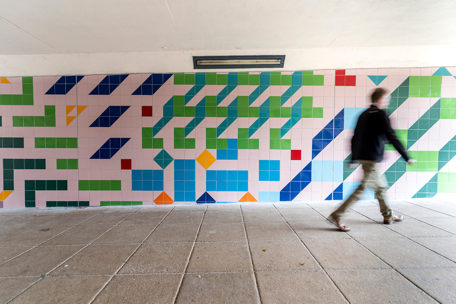 Referencing the brickwork, paving, and stain glass windows in the town centre, she engaged with local college students and the public to develop her idea, which eventually saw 3,000 mosaic tiles installed for pedestrians walking through the underpass.