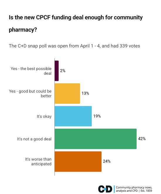 A C+D snap poll on the CPCF funding deal shows community pharmacy is unhappy with it...